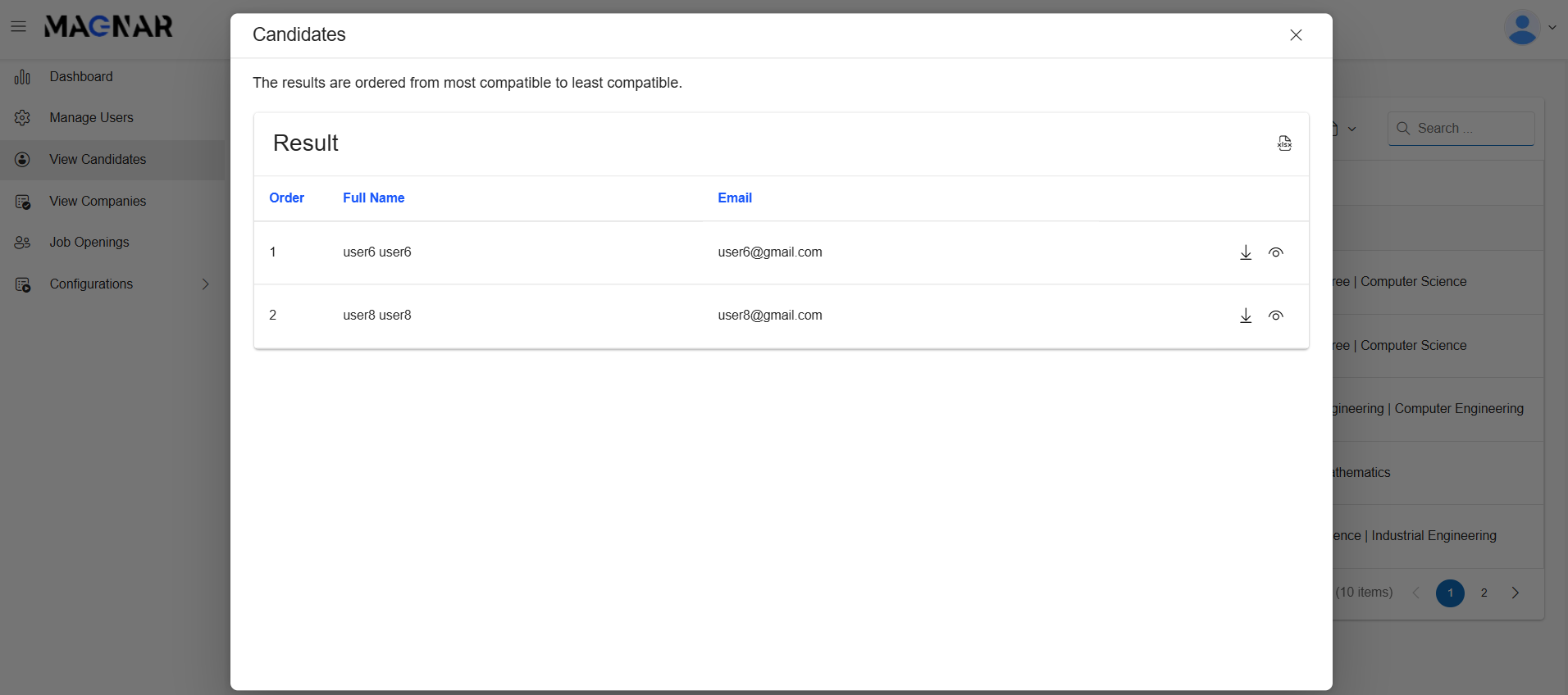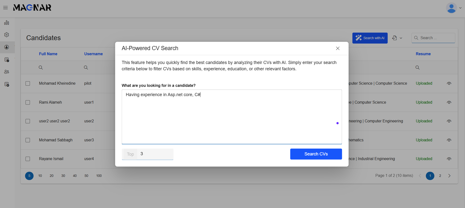 Recruiters can simply type a natural language query such as “Give me applicants having experience in C#” and the system will automatically analyze all uploaded CVs, rank candidates by relevance, and display the top results.
