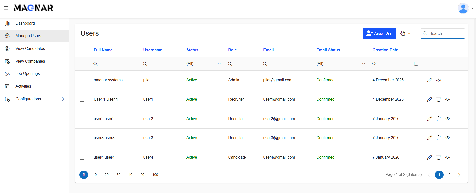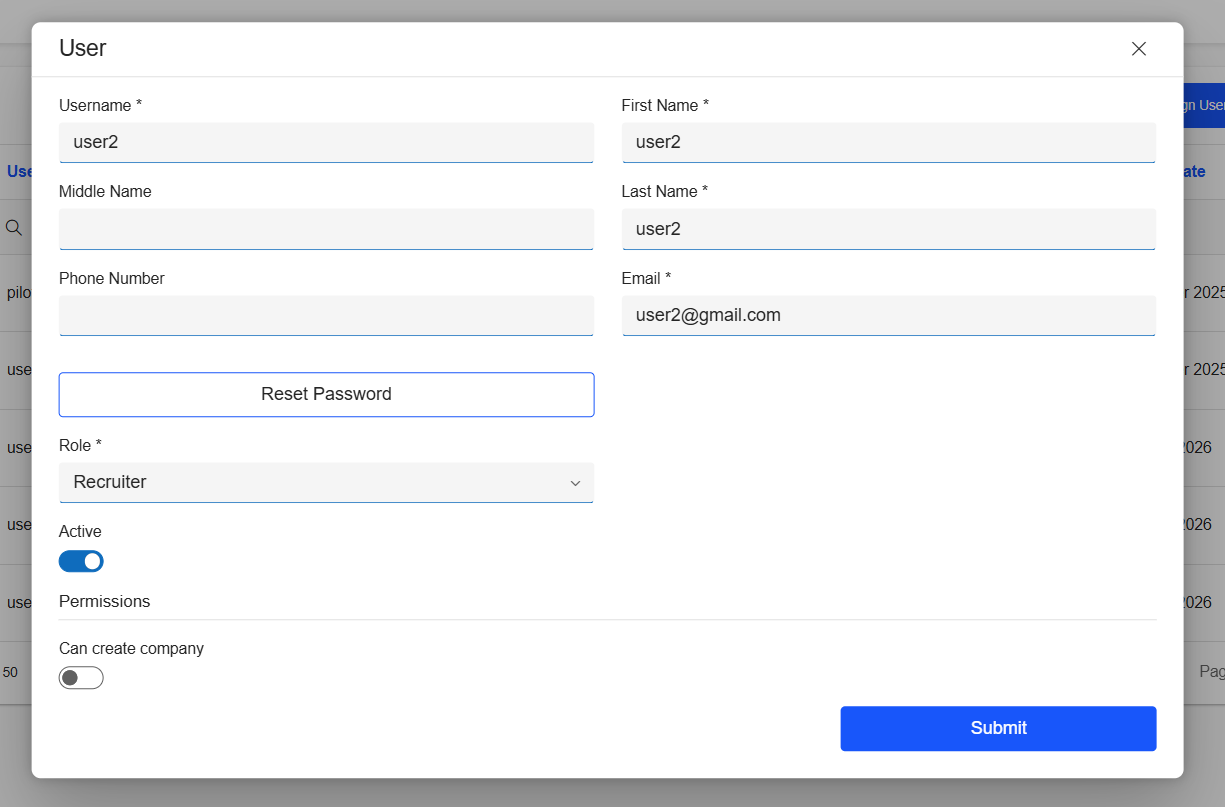- Change user roles (e.g., candidate to recruiter, recruiter to admin)
